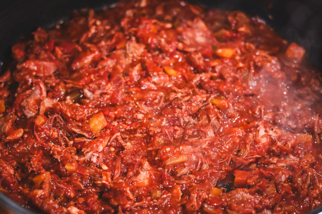 After three hours, the shanks are removed and shredded, bones and excess fat discarded. At this point, the rest of the tomatoes and two cups of chicken stock are added along with the shredded pork. This second stage of cooking balances the sauce, lightens it just slightly with broth, and adds back freshness from that last can of tomatoes. Another hour uncovered in the oven at 300°F thickens everything and melds all the flavors into one cohesive, silky sauce.