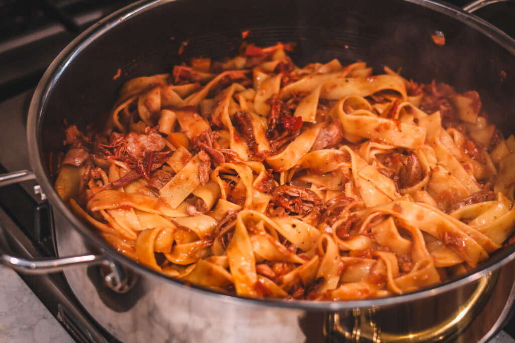 Every step here has a purpose. Smoking the meat adds depth. Caramelizing vegetables builds sweetness. Blooming dried herbs intensifies their fragrance. Cooking down tomato paste and wine layers in concentrated flavor. And the long braise transforms a tough cut of pork into tender, melt-in-your-mouth meat that enriches the sauce with its natural collagen. The result is more than a pasta sauce, it’s a master class in how to build flavor step by step.